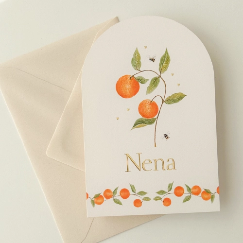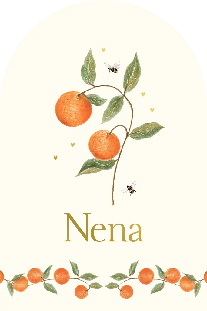 Zoek je een uniek geboortekaartje? Kies dan voor dit geboortekaartje met sinaasappel en goudfolie! Het kaartje is gemaakt van stevig karton en heeft een mooie boogvorm. De sinaasappels en bijtjes zijn origineel gedrukt en geven het kaartje een retro en lief karakter. Het kaartje is geschikt voor een meisje of jongen en is unisex.