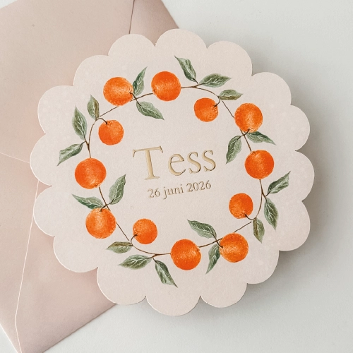 Op zoek naar een origineel geboortekaartje? Dan is dit kaartje met een vorm met golfjes en een sinaasappel krans echt bijzonder.