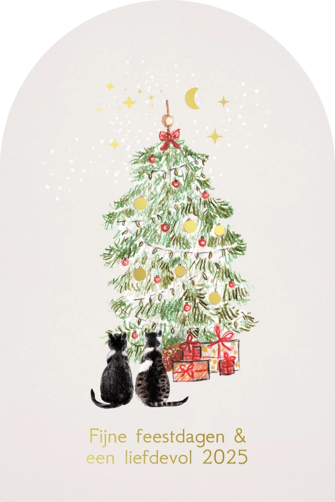 kerstkaart kerstboom poezen pakketjes folie originele vorm boog