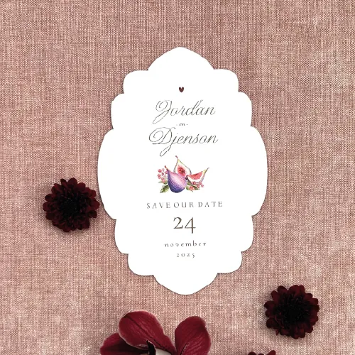 Deze romantische save the date kaart uit de Fleur de Figue serie is een sfeervolle eerste aankondiging van jullie trouwdag. De zachte kleuren, botanische vijgenillustratie en elegante lettertypes geven de kaart een rustige, liefdevolle uitstraling. Ideaal om jullie gasten alvast warm te maken voor de bruiloft. Personaliseer de kaart in de editor met jullie eigen namen en trouwdatum en stuur een stijlvolle aankondiging die direct de toon zet.
