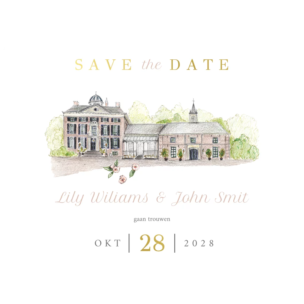 save the date met trouwlocatie Kasteel Rozendael in een originele vorm uit de serie blooming