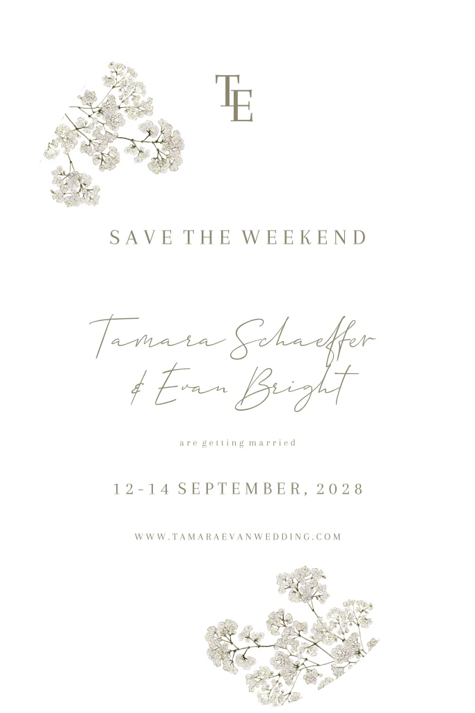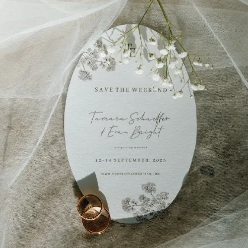 Save the date kaart met chique getekend gipskruid in een bijzondere ovale vorm Modern, handgetekend en chique!
