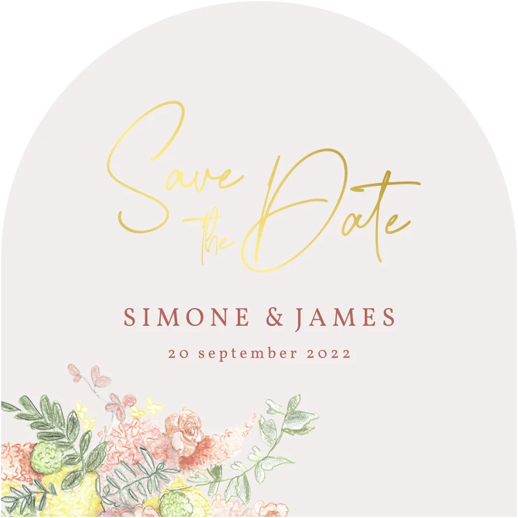 save the date kaart getekende bloemen met goudfolie in boog vorm