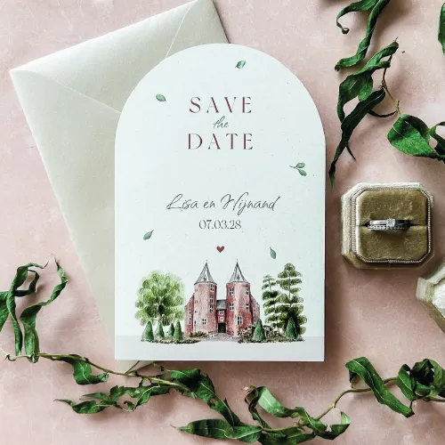 save the date in boog vorm trouwlocatie blaadjes bruin groen