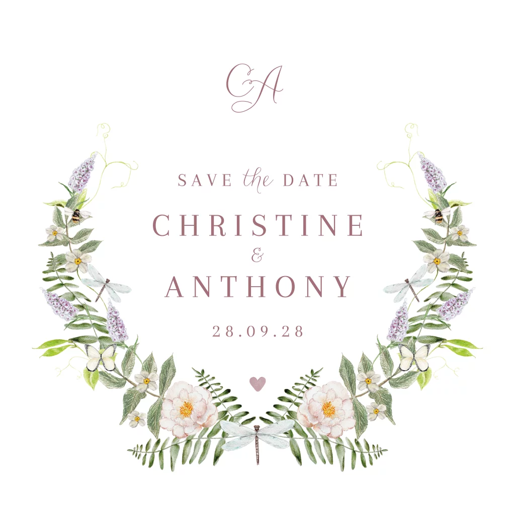 Save the date kaart originele vorm botanisch krans vogeltjes