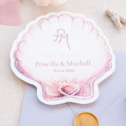 save the date met getekende schelp in het thema strand en zee