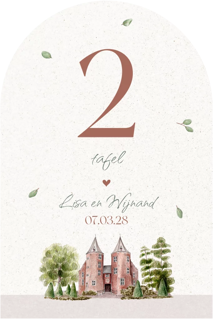 tafelnummer in boog vorm trouwlocatie blaadjes bruin groen