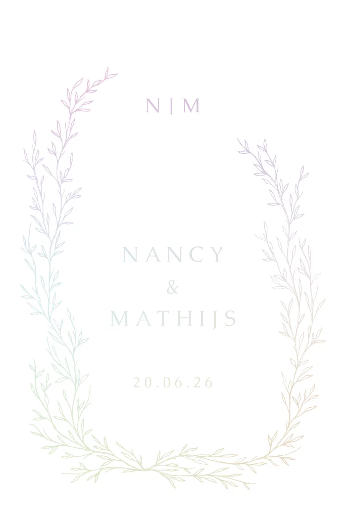 De Trouwkaart heeft een getekende krans met holografisch folie en heeft een unieke boogvorm. Daarom is het een unieke en romantische trouwkaart. Deze Trouwkaart is perfect voor een moderne bruiloft.