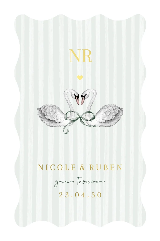 trouwkaart getekende zwaanen strik streepjes golvende vorm groen goud