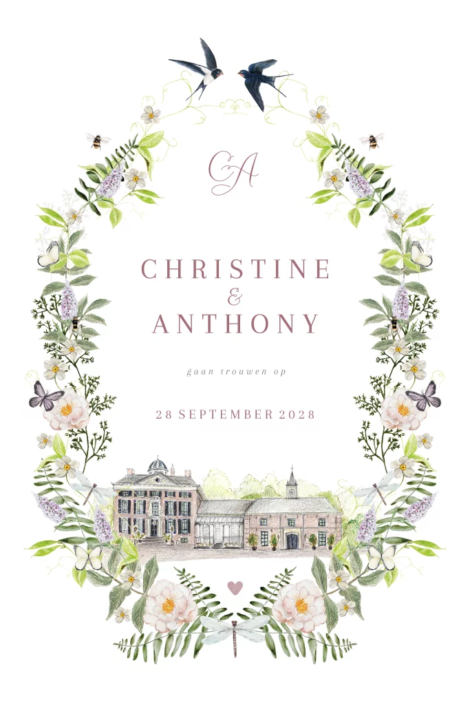 Trouwkaart originele vorm botanisch krans vogeltjes