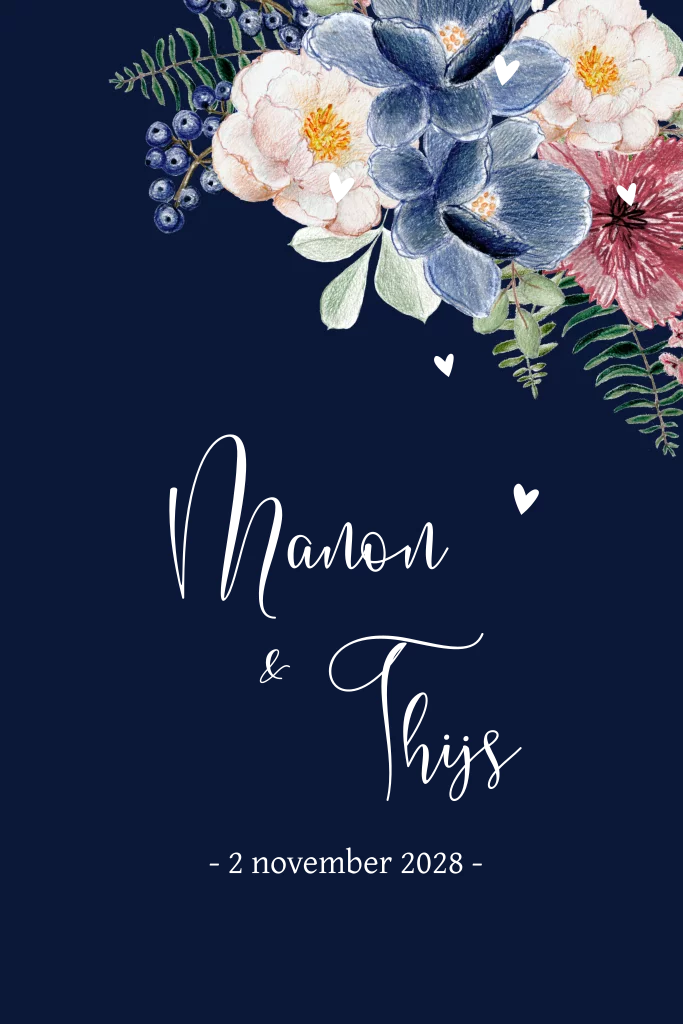 Donkerblauwe trouwkaart goudfolie aquarel bloemen