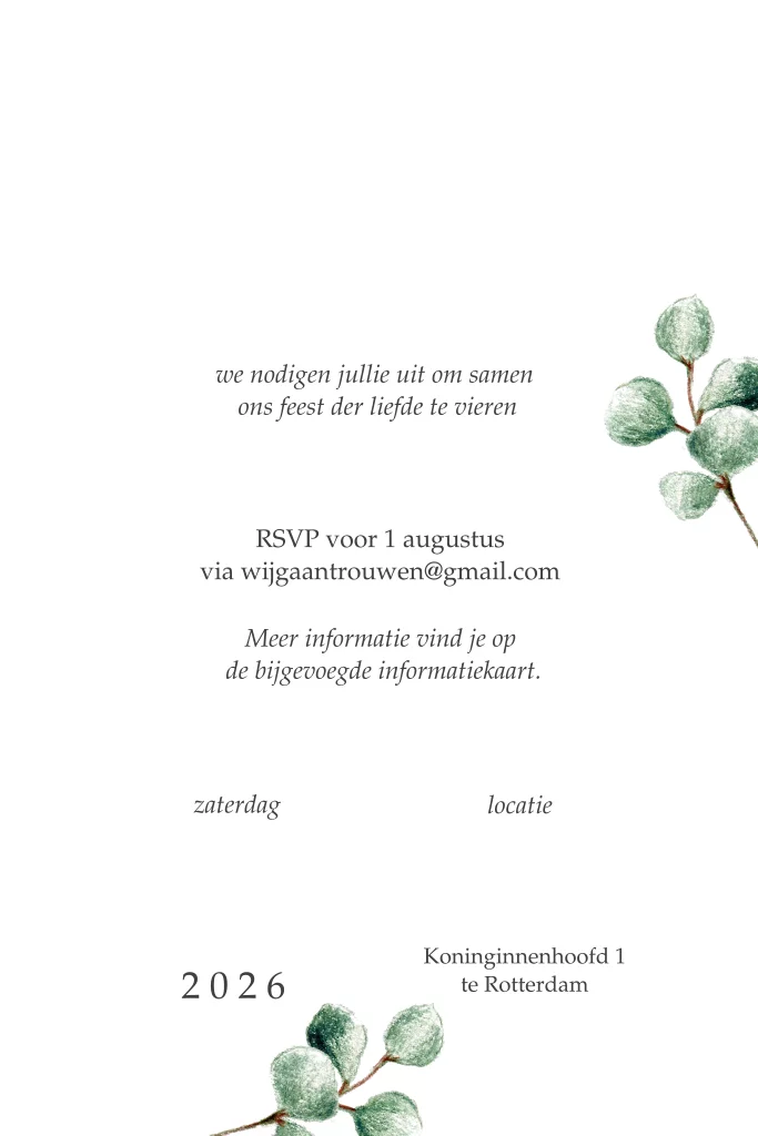 minimalistische trouwkaart typografie en eucalyptus zilverfolie