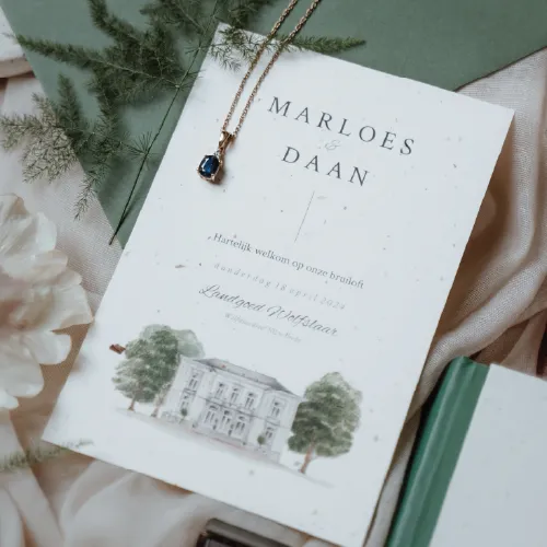 Trouwkaart met getekende trouwlocatie Landgoed Wolfslaar gedrukt op duurzaam papier. Handgetekend en chique! Liever een andere trouwlocatie op de kaart? Dan teken ik deze graag voor jullie! Neem daarvoor contact op.
