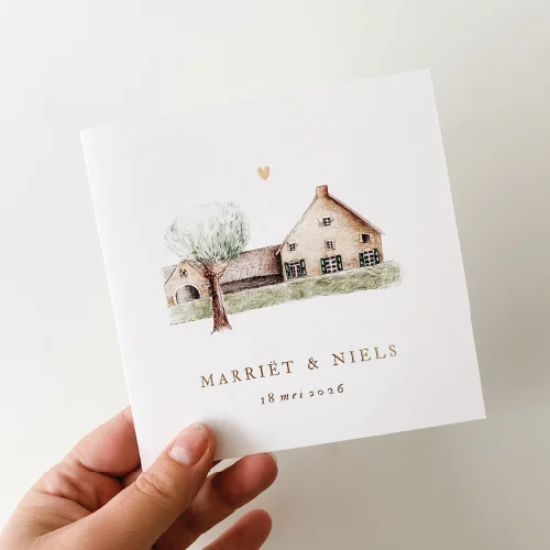 Stijlvolle trouwkaart trouwlocatie winselerhof met goudfolie. In de editor kan je eenvoudig bij getekende locaties andere locaties vinden. Op deze trouwkaart is Winselerhof te Landgraaf afgebeeld.