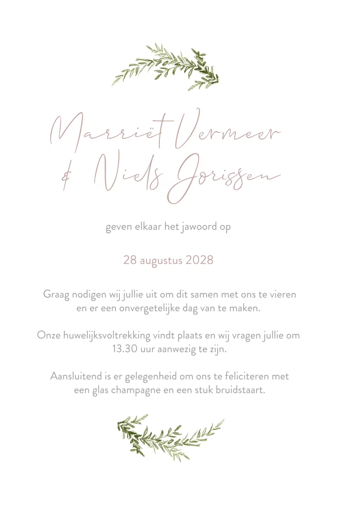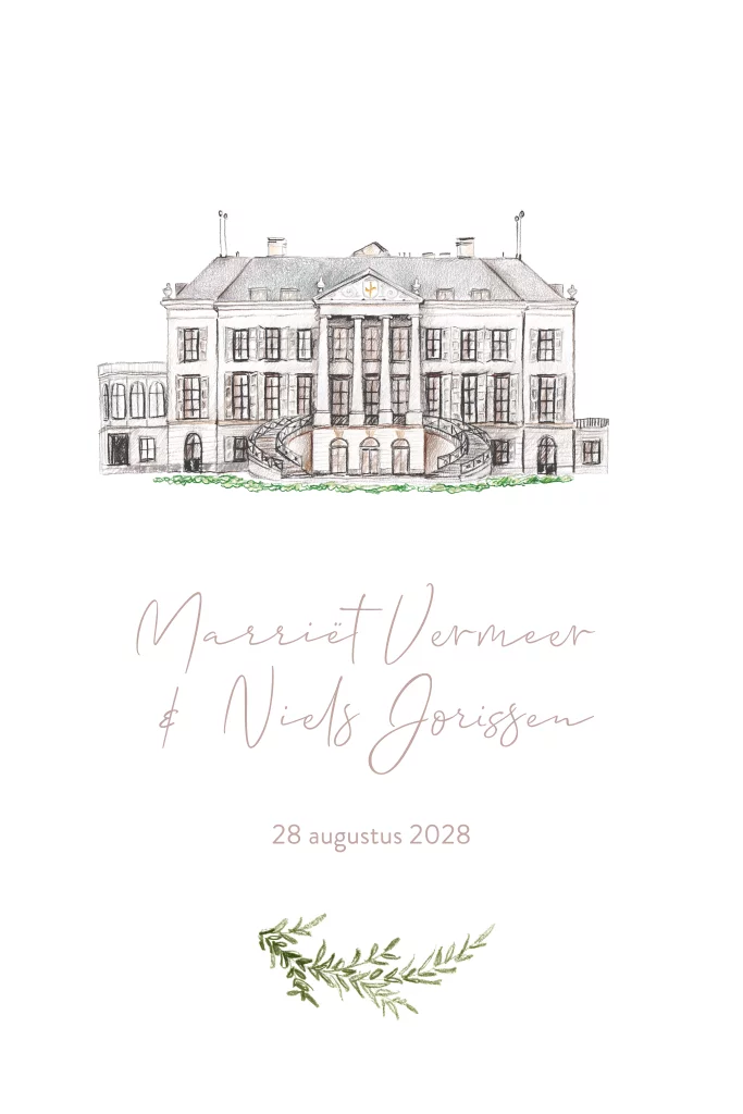 Stijlvolle trouwkaart met trouwlocatie en sierlijke takjesTotaalprijs: 0 |