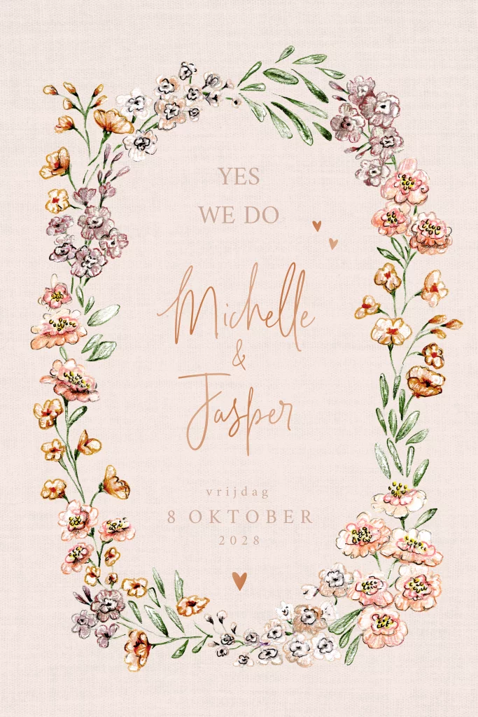 Trouwkaart met een getekende bloemenkrans en hoogglans terra met linnen achtergrond en hartjes.