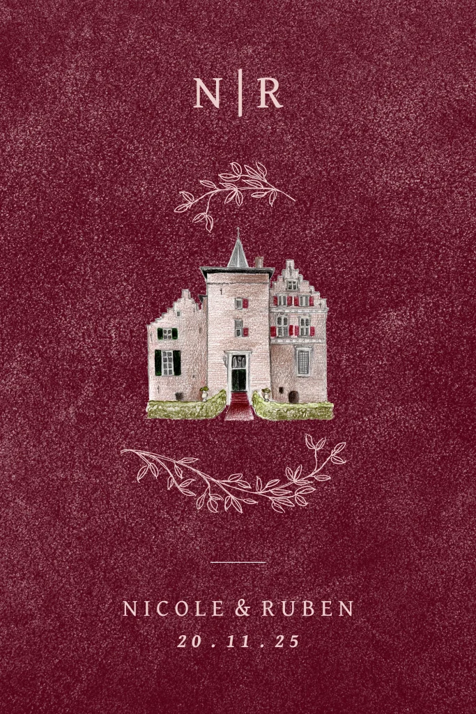 Een enkele trouwkaart met trouwlocatie Kasteel Wijenburg. In de editor staan nog meer trouwlocaties en vervang de locatie voor die van jullie. De achtergrond is in velvetlook. De kleur is eenvoudig aan te passen in de kaartopmaker.