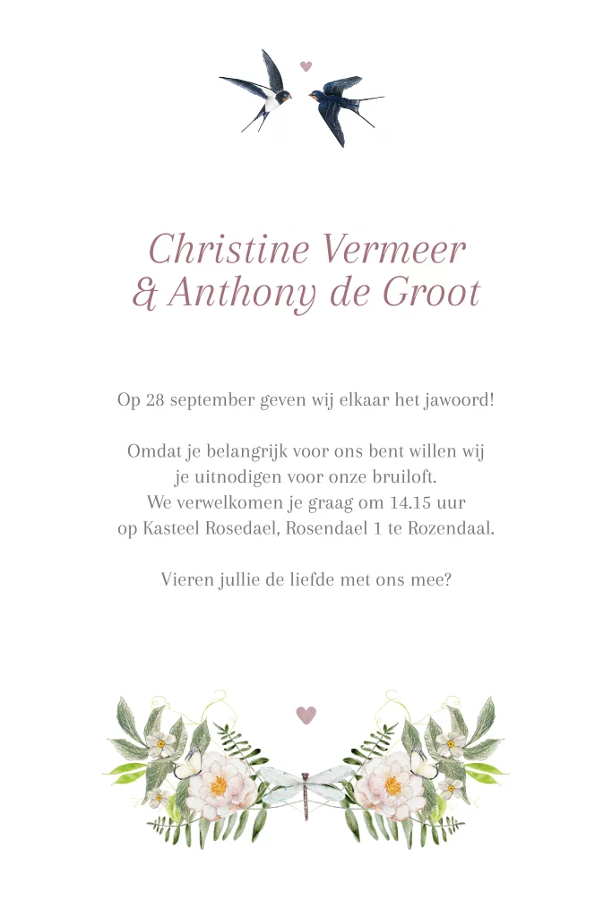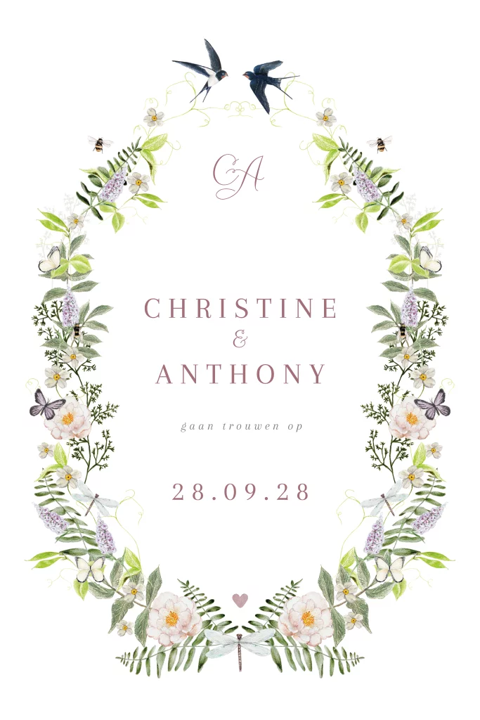 Dubbele trouwkaart met originele vorm en botanisch krans met vogeltjes| Totaalprijs: 0 |