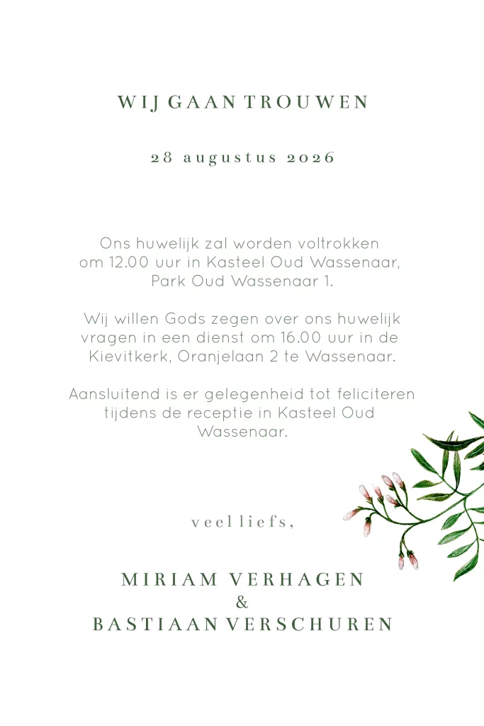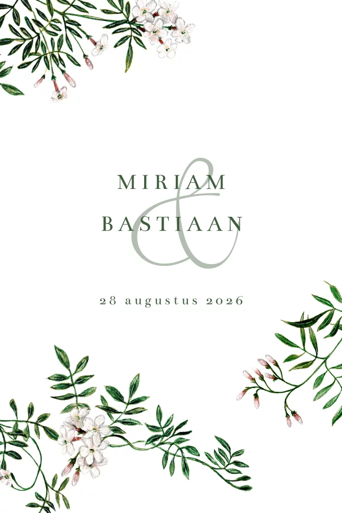 Chique vrolijke trouwkaart met botanische jasmijn takken