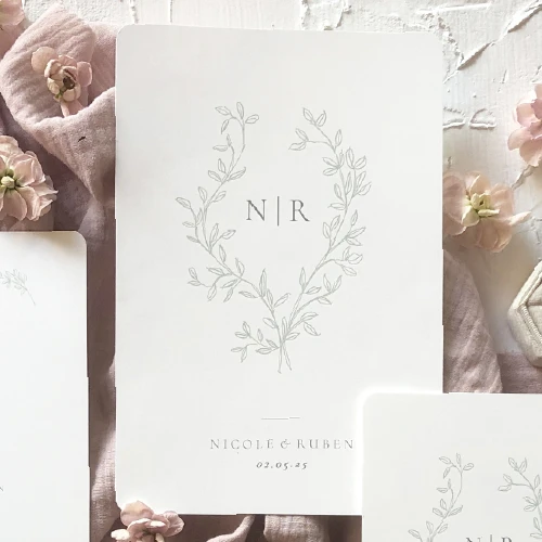Trouwkaart chique krans getekend logo. Modern, handgetekend en chique!