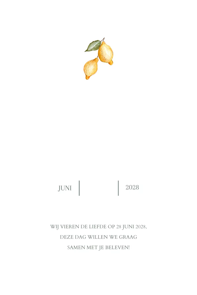 Trouwkaart met citroentjes en trouwlocatie doddendael met goudfolie. Handgetekend en chique!