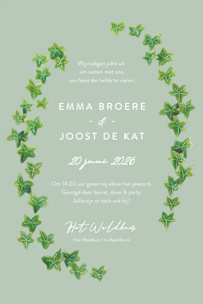 Trouwkaart met groene klimop blaadjes afgewerkt met goudfolie.