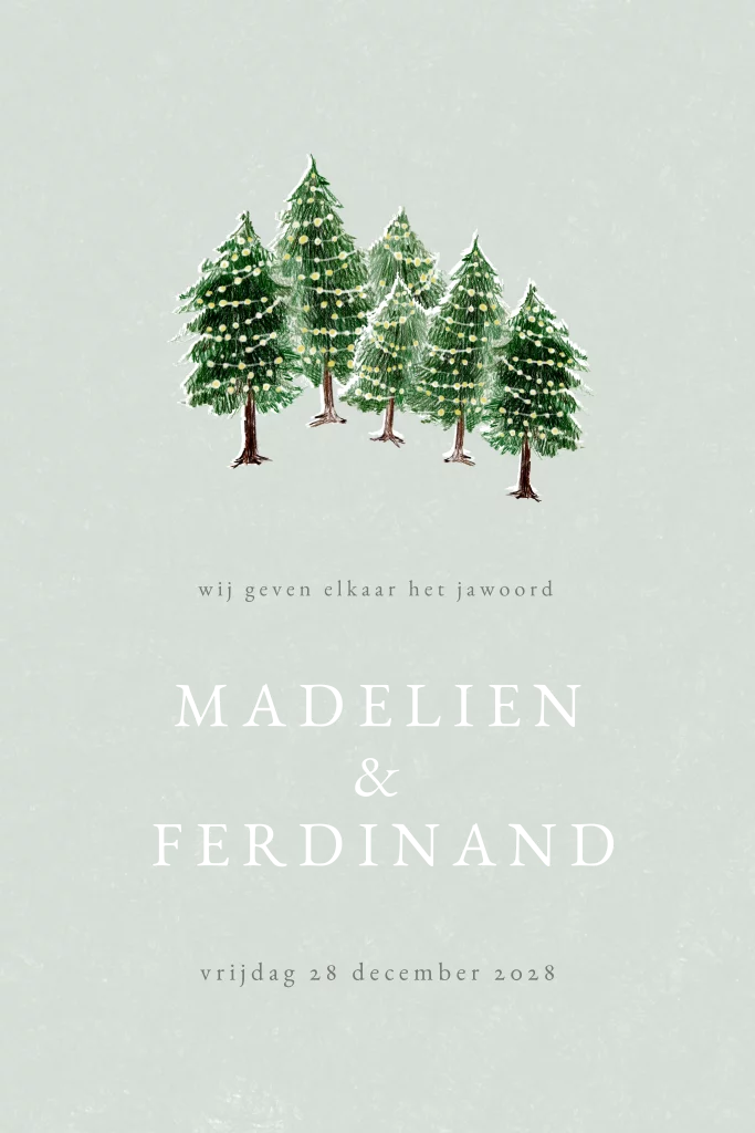 Trouwkaart goudfolie kerstbomen winter bruiloft. Makkelijk je eigen kaart aanpassen met de editor naar een andere kleur door de achtergrond aan te passen. De kaart in een ander formaat? Heb je een bijpassend kaartje nodig? Het is allemaal mogelijk! Mail of bel en ik help je verder.
