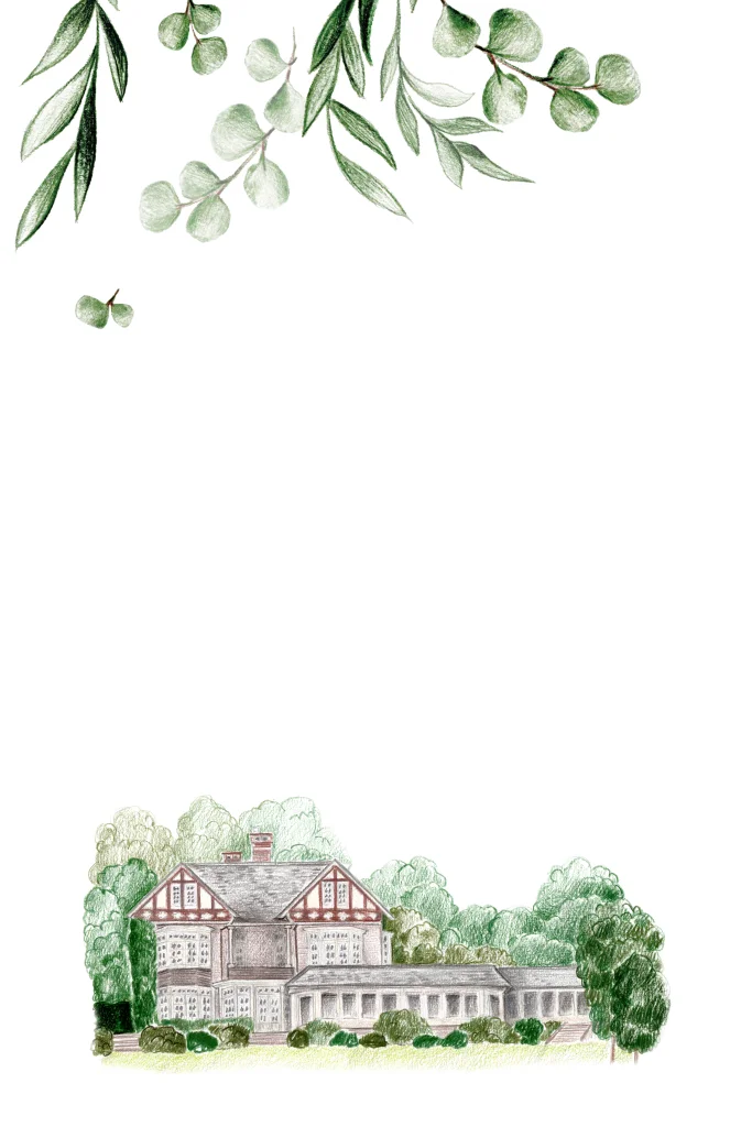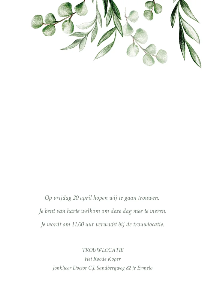 Romantische trouwkaart met trouwlocatie met groene blaadjes en koperfolie.