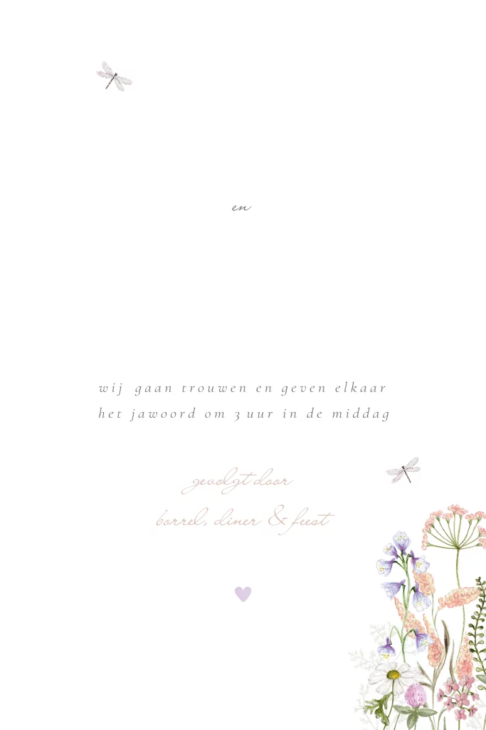 Trouwkaart met getekende veldbloemen en libelle en afgewerkt met goudfolie. Makkelijk je eigen kaart aanpassen met de editor naar een andere kleur door de achtergrond aan te passen. De kaart in een ander formaat? Heb je een bijpassend kaartje nodig? Het is allemaal mogelijk! Mail of bel en ik help je verder.