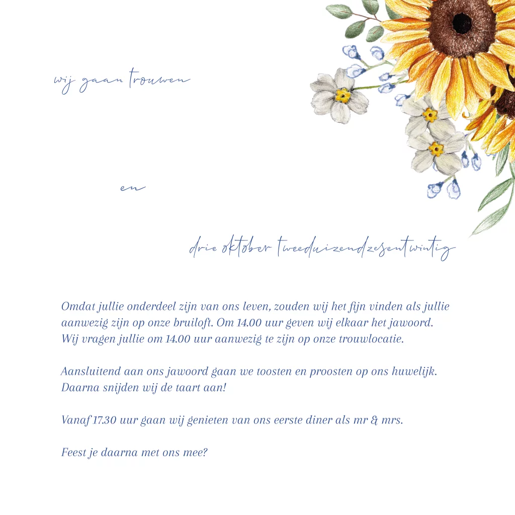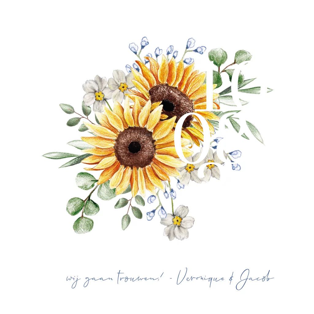 Trouwkaart met zonnebloemen, eucalyptus, blauwe bloemetjes en afgewerkt met goudfolie.