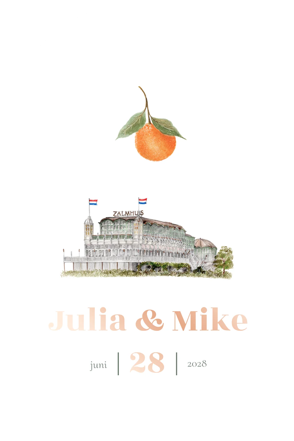 De sinaasappel staat symbool voor geluk, liefde en overvloed, wat deze trouwkaart extra betekenisvol maakt. Ideaal voor een zomerbruiloft, een destination wedding of een bruiloft met een Zuid-Europese sfeer. Dankzij het tijdloze ontwerp is de kaart stijlvol én vrolijk tegelijk.
