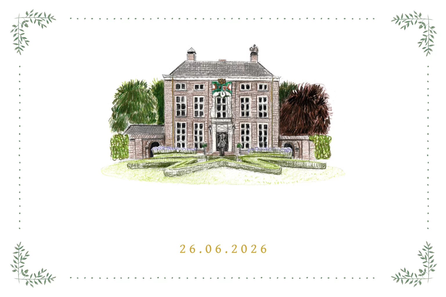 Stijlvolle trouwkaart trouwlocatie met goudfolie. In de editor kan je eenvoudig bij getekende locaties andere locaties vinden. Op deze trouwkaart is Landgoed de Havixhorst afgebeeld.