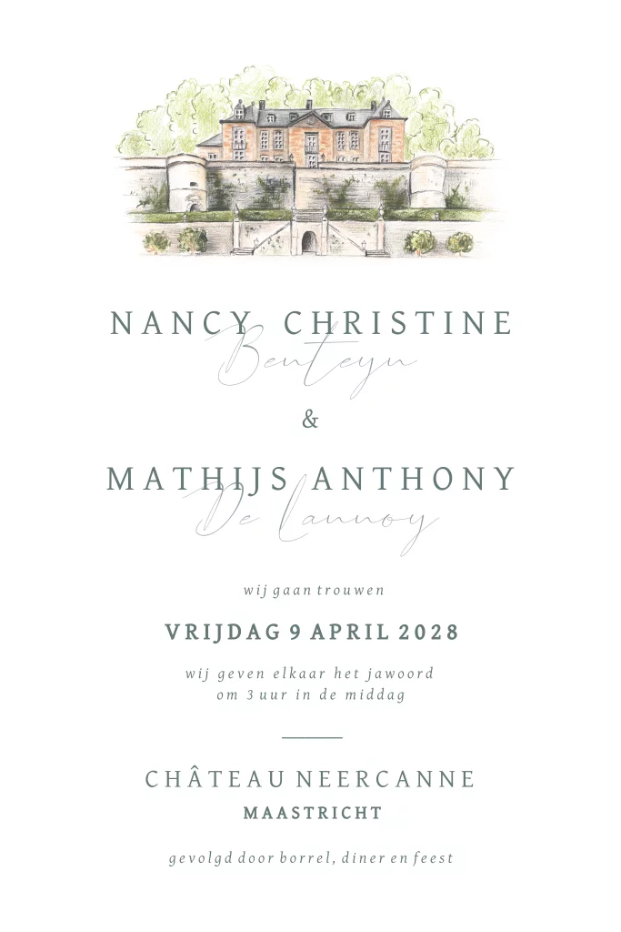 Trouwkaart met getekende trouwlocatie Chateau Neercanne. Handgetekend en chique! Liever een andere trouwlocatie op de kaart? Dan teken ik deze graag voor jullie! Neem daarvoor contact op. Het tekenen van een nieuwe locatie heeft wel tijd nodig. Hou hier rekening mee in je planning! Makkelijk je eigen kaart aanpassen met de editor naar een andere kleur door de achtergrond aan te passen. De kaart in een ander formaat? Heb je een bijpassend kaartje nodig? Het is allemaal mogelijk! Mail of bel en ik help je verder.