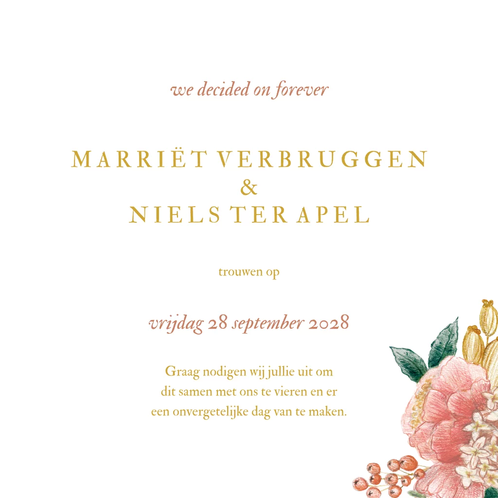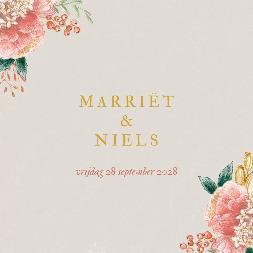 Trouwkaart klassiek getekend Bloemen beige