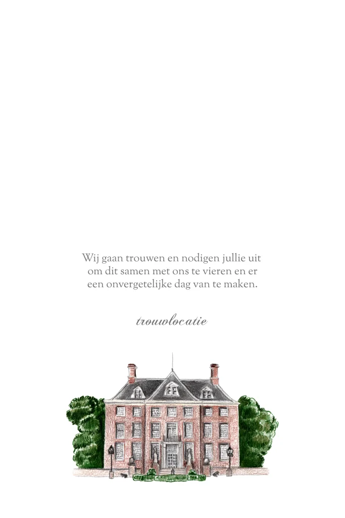 Trouwkaart klassiek logo met kasteel Amerongen. Deze kaart is afgewerkt met goudfolie. Kies eenvoudig een andere kleur folie of kleur uit de editor. Handgetekend, tijdloos en chique!