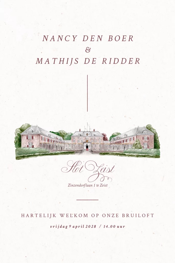 Klassiek moderne trouwkaart met getekende trouwlocatie Slot Zeist. Handgetekend en chique! Liever een andere trouwlocatie op de kaart? Dan teken ik deze graag voor jullie! Neem daarvoor contact op. Het tekenen van een nieuwe locatie heeft wel minimaal 1 week nodig. Hou hier rekening mee in je planning!