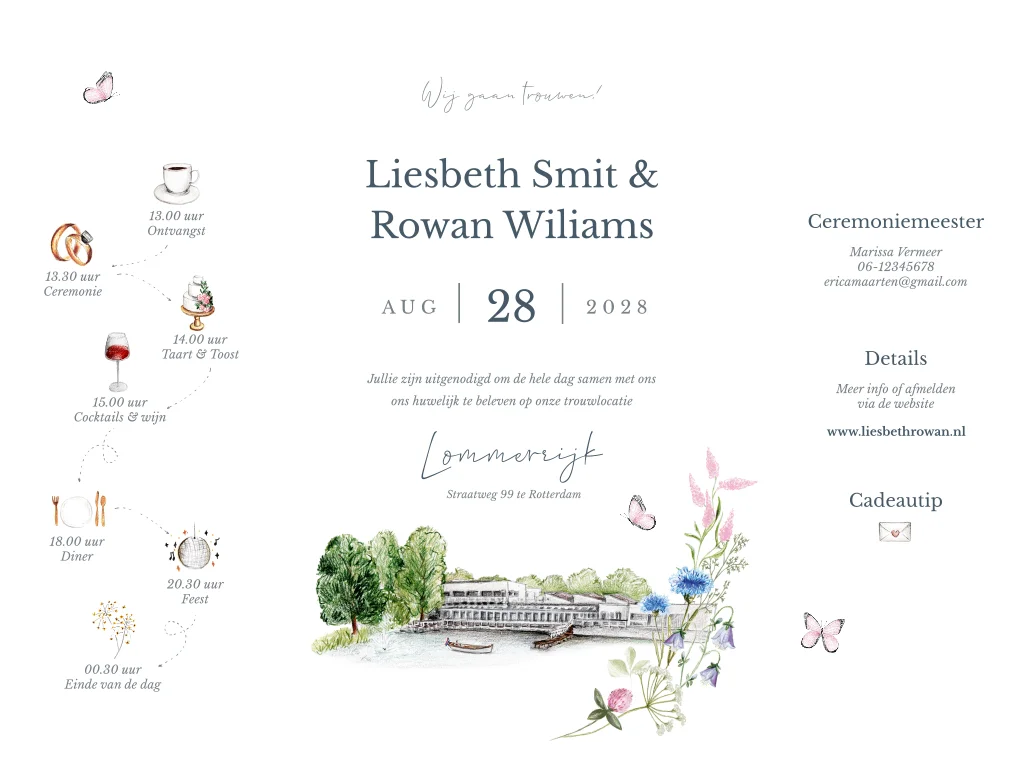 Wauw! Deze luikvouw trouwkaart met veldbloemen krans met pastel blauwe en roze bloemen is chique en door de rondvliegende vlinder ook romantisch. Op deze trouwkaart is de trouwlocatie Lommerrijk in Rotterdam te zien maar kan je natuurlijk elke locatie toevoegen vanuit de beeldbank.
