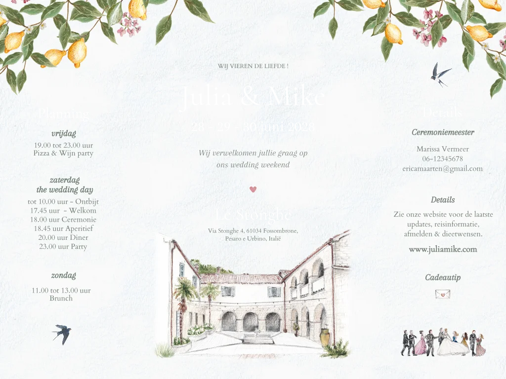 Prachtige vrolijke luikvouw kaart met citroenenkrans met zwaluwen, prachtig voor een italiaanse bruiloft.