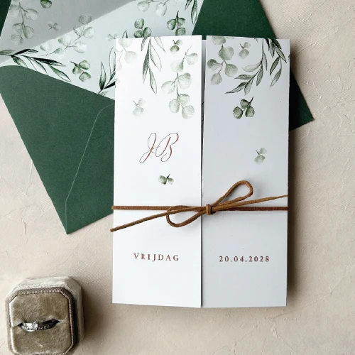 Deze luikvouw trouwkaart heeft een rustige, natuurlijke uitstraling door het gebruik van zachte groene botanische illustraties. De bladeren aan de bovenkant geven de kaart een fris en verfijnd accent, terwijl de illustratie van de trouwlocatie het Rode Koper centraal op de kaart staat.