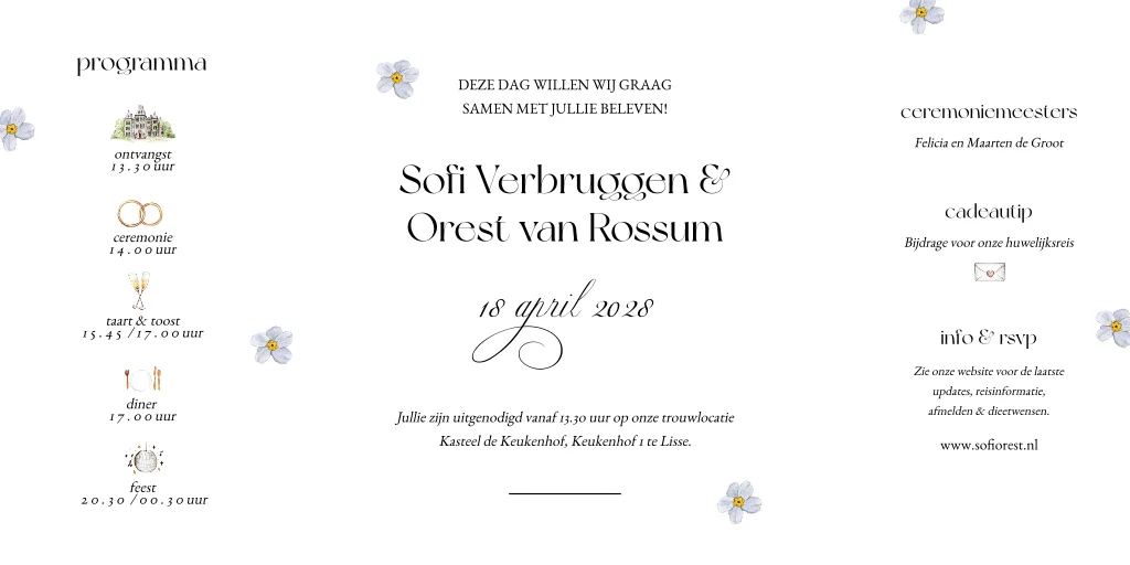De luikvouw zorgt voor een overzichtelijke indeling van de kaart. Op de voorzijde staan de namen en trouwdatum centraal, terwijl de binnenzijde ruimte biedt voor de uitnodigingstekst en aanvullende gegevens. Dankzij het rustige ontwerp blijft alles goed leesbaar, ook wanneer je meerdere teksten toevoegt.