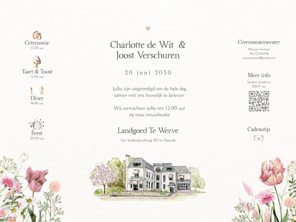 Deze luikvouw trouwkaart combineert een illustratie van de trouwlocatie met zachte botanische bloemen langs de randen. De bloemen geven het ontwerp een romantische en natuurlijke uitstraling, terwijl de illustratie van de trouwlocatie centraal staat. In het voorbeeld zie je Landgoed Te Werve, maar deze locatie is in de editor eenvoudig te vervangen.