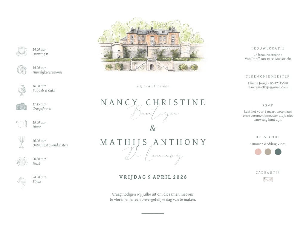 Deze luikvouw trouwkaart is ontworpen rondom één duidelijk element: de illustratie van jouw trouwlocatie. Op de voorkant staat de trouwlocatie centraal, gecombineerd met een rustige, zachte achtergrond waardoor de illustratie mooi tot zijn recht komt. Het voorbeeld toont Château Neercanne, maar in de editor kies je eenvoudig jouw eigen trouwlocatie uit de 180 beschikbare illustraties.