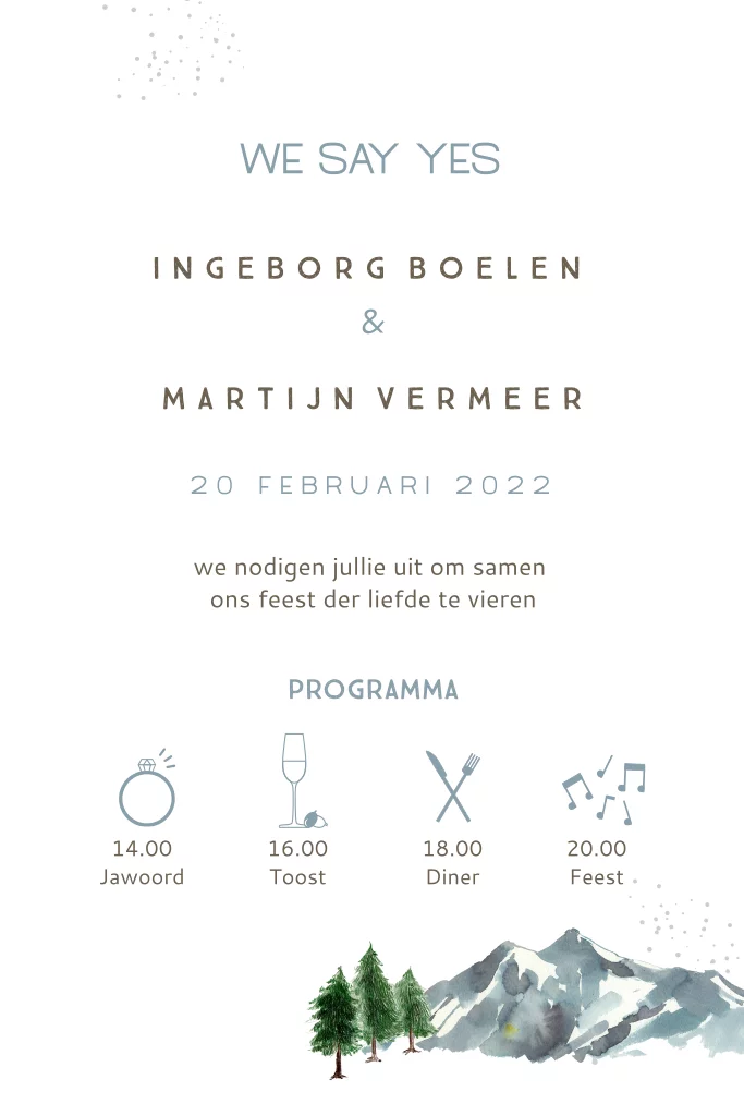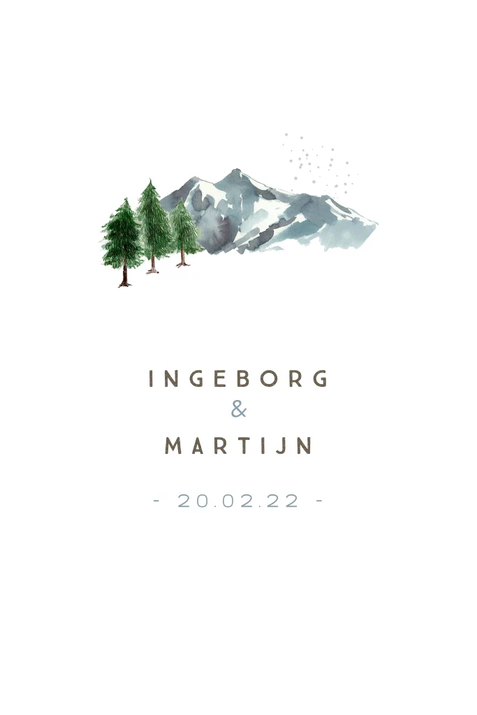 Minimalistische moderne trouwkaart met een landschap met bergen en een paar dennenbomen. Deze trouwkaart is super geschikt als je in de bergen trouwt of voor een lekker winters gevoel.Maak je eigen kaart met de editor. Er is genoeg keuze uit prachtige afbeeldingen, clip-art en lettertypes. Vragen? Neem contact op!