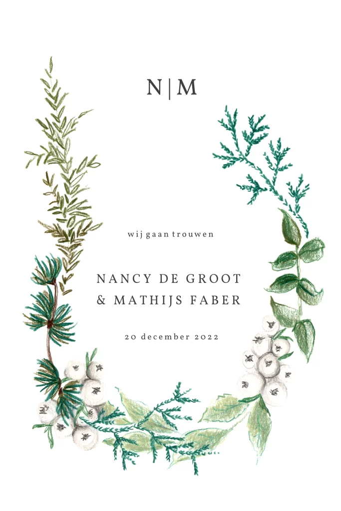 Trouwkaart met getekende winterkrans Modern, handgetekend en chique!