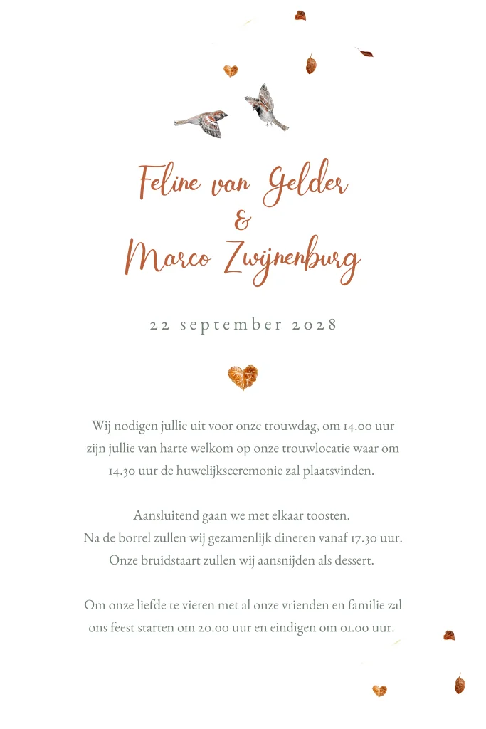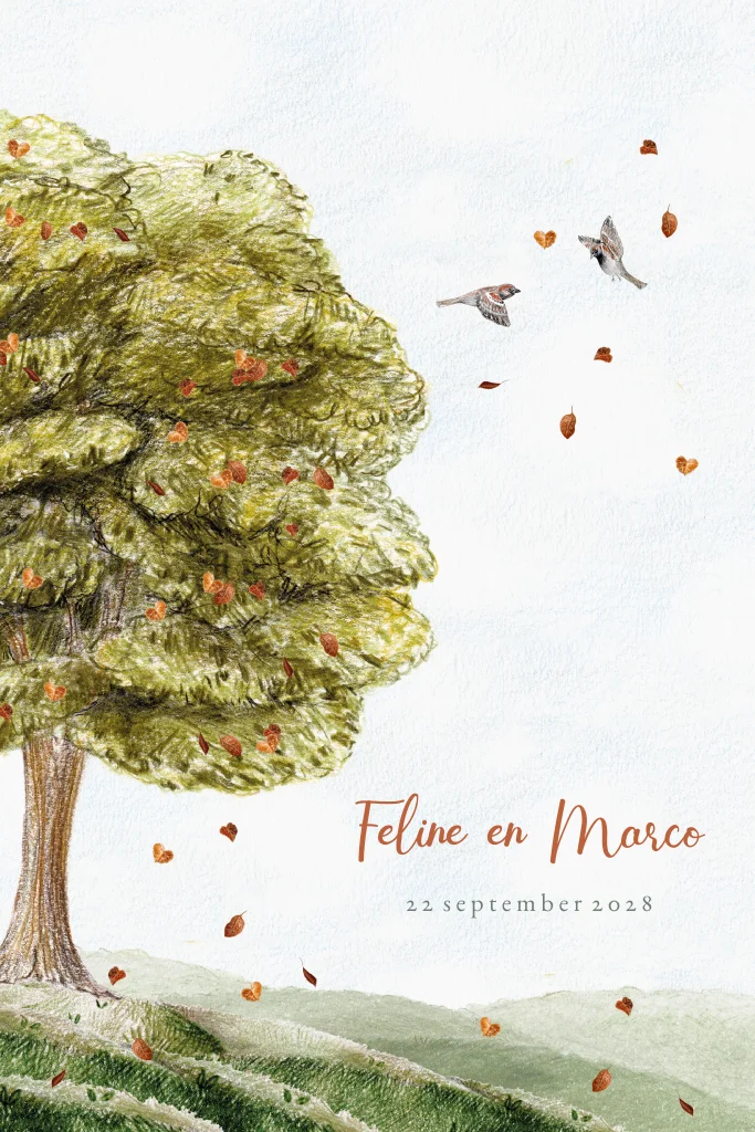 Romantische herfst trouwkaart met boom en mussen. De subtiele rondvliegende herfstblaadjes maken deze kaart af. De afgeronde hoeken geven het een moderne twist.