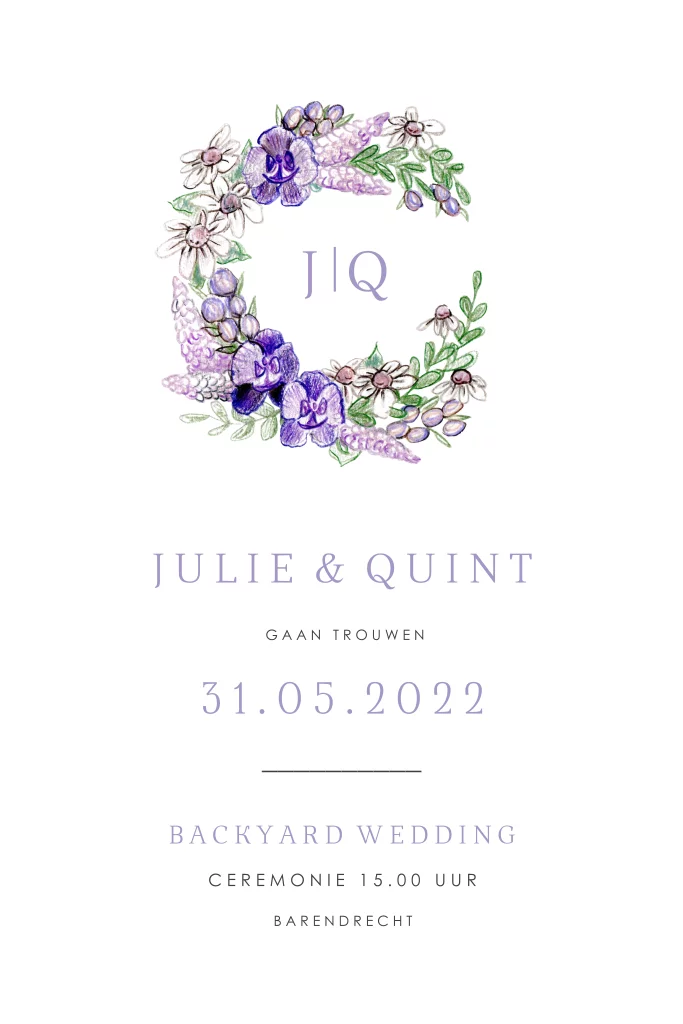 Romantische trouwuitnodiging lila bloemen krans. Modern, handgetekend, tijdloos en chique!