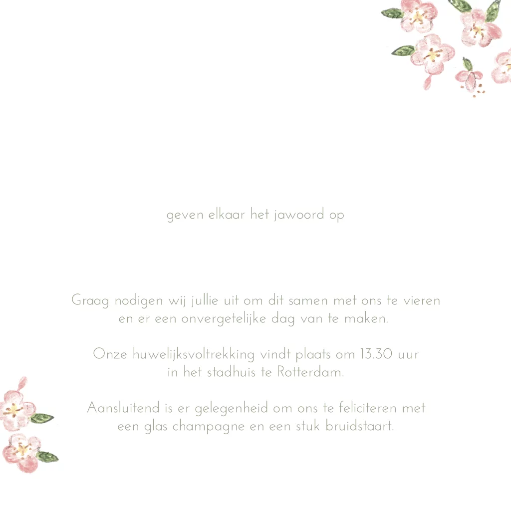 Trouwkaart met getekende kersenbloesem in zachte pasteltinten. De teksten zijn met goudfolie maar kunnen in elke kleur. Maak je eigen kaart met de editor. Er is genoeg keuze uit prachtige afbeeldingen, clip-art en lettertypes. Vragen? Neem contact op!