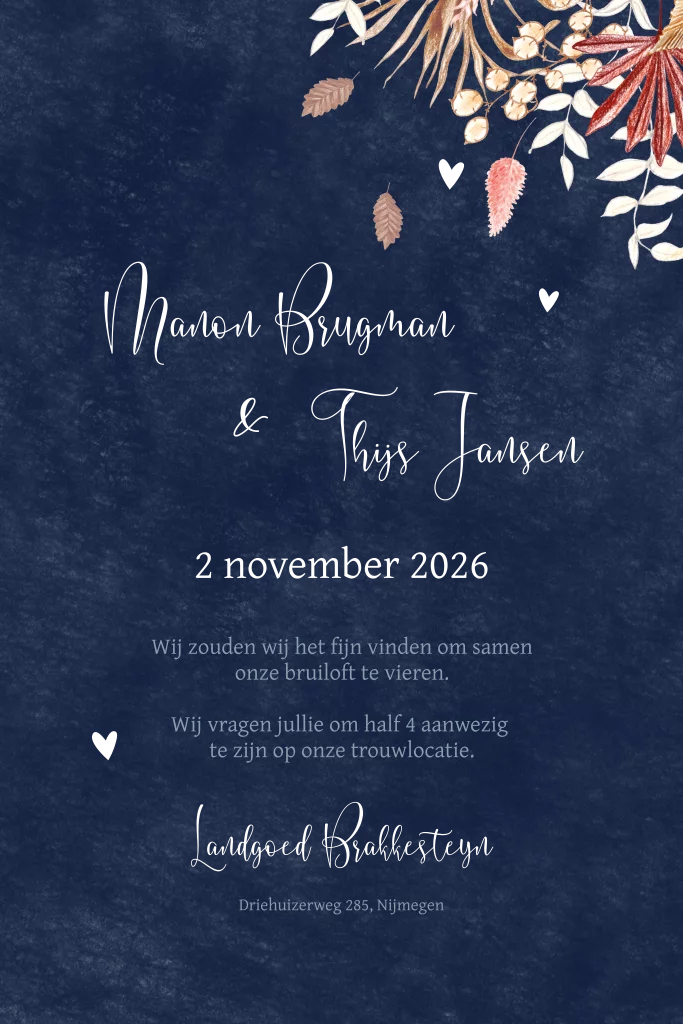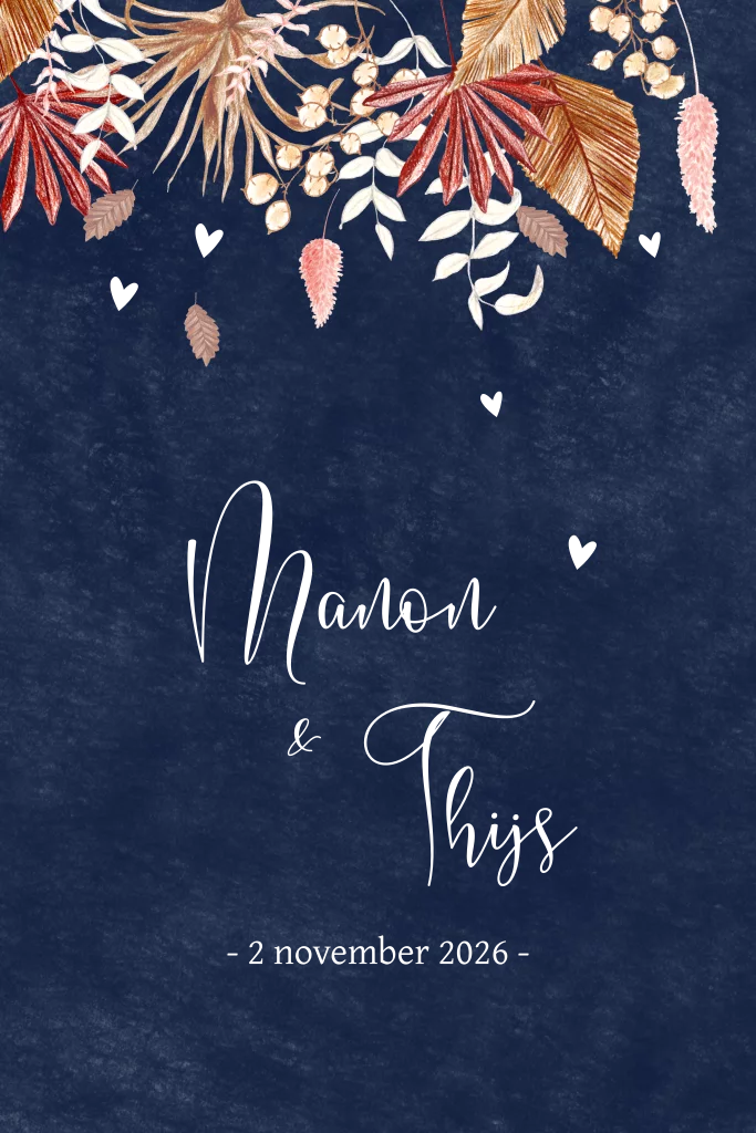 Donkerblauwe trouwkaart rosefolie droogbloemen.