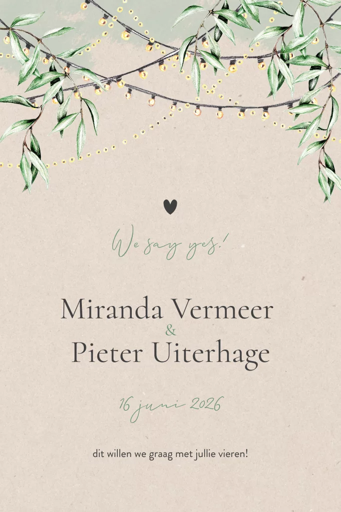 Feestelijke Trouwkaart met lampjes en olijftakjes