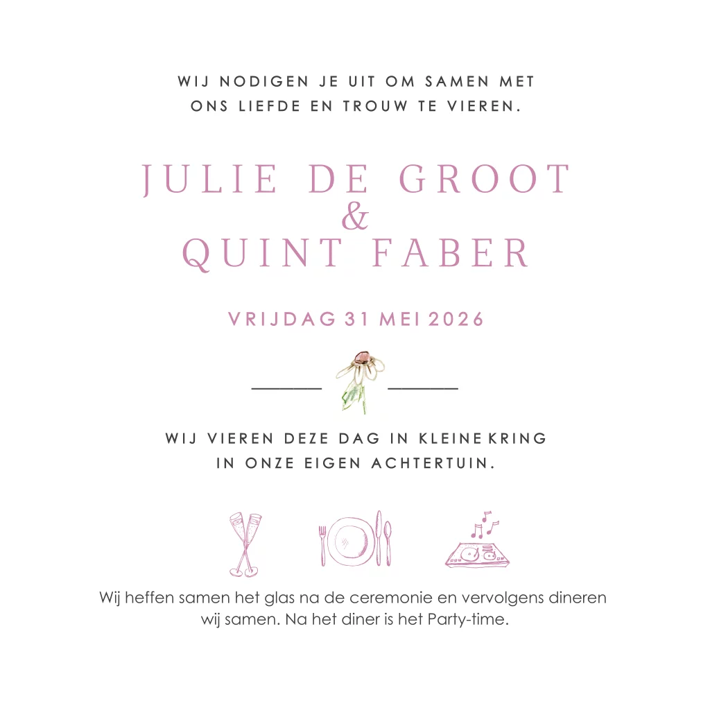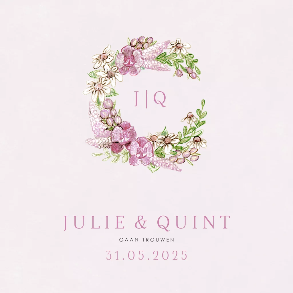 Romantische trouwuitnodiging roze bloemen krans. Modern, handgetekend, tijdloos en chique!